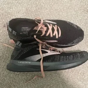This near perfect condition pair of Brooks running shoes are perfect for any runner. The soles of the shoes are in great condition with the shoes only being worn one time. They are black and have light pink accents. They are women’s size 8.
