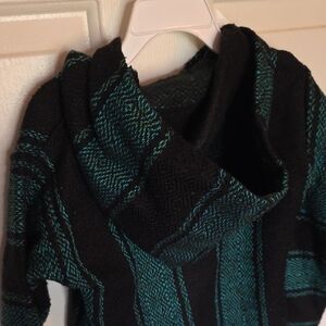 Stylish black and teal Baja pullover hoodie by Molina. Kids size small measures 13 inches across and 17 inches long. It has long sleeves, a hood and front pocket. Excellent condition, like new. No snags or stains. Unisex, so cute!