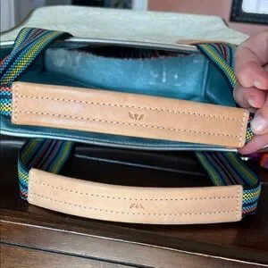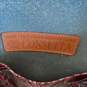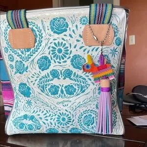 Chic Consuela tote with teal floral design. Cream background enhances the vibrant pattern. Perfect for adding flair to any outfit.