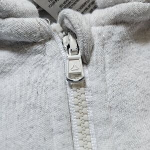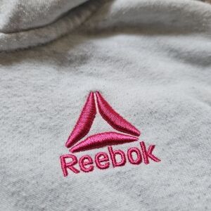 Cozy gray hoodie featuring a pink Reebok logo. Perfect for casual wear.