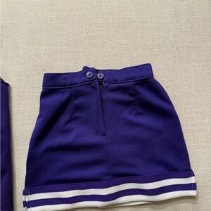 This stylish kids cheerleading set features a vibrant purple and white design. Perfect for young cheerleaders, this set combines comfort and style. Used condition, some pulls on skirt, some loose threads on both pieces, but no rips or tears or stains. Still has a lot of life left!