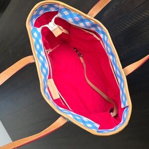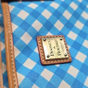 Dooney & Bourke Blue Zip Top Gingham Canvas Tote Shoulder Bag with Tan Leather Accents
