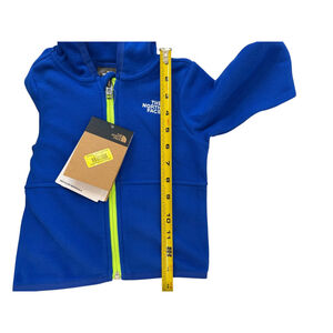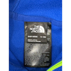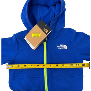 This is a new with tags The North Face Baby/Bébé full-zip hoodie, size 12-18M. The hoodie is a vibrant blue color and features a bright green zipper. The North Face logo is embroidered in white on the left chest. The garment is made of 100% polyester. The hoodie measures approximately 14 inches in length and 11 inches in width. The item is in excellent condition with no visible imperfections.