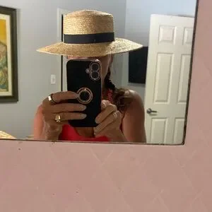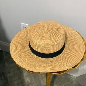 Chic straw hat by Dynamite. Features a sleek black band. Ideal for sunny outings.