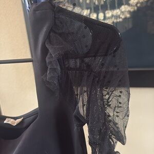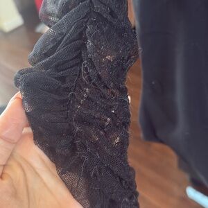 This elegant black top features stylish sheer sleeves, perfect for any occasion. Elevate your wardrobe with this chic and versatile piece. There’s some fraying around the elastic on the sleeve. Not noticeable unless up close. (In the photos).