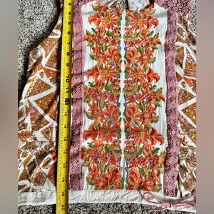 Vibrant tank top with intricate embroidery. Features floral and geometric patterns. Sleeveless design with lace accents.