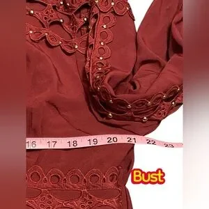 Elegant deep red dress with lace accents. Features long sleeves, gold studding throughout, and an elastic waistband for a flattering fit. Ideal for stylish outings.