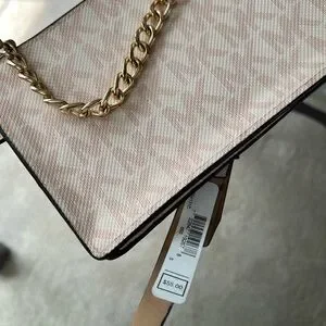 Stylish Fanny pack belt bag with iconic monogram Michael Kors MK design. Features a striking gold chain. Perfect for versatile wear. Nude pink.