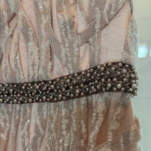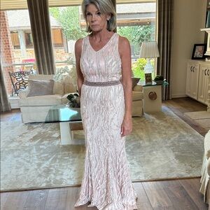 Stunning blush maxi dress by Jax. Features a beaded waist and elegant pattern. Ideal for formal events.