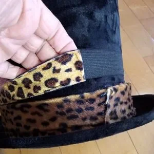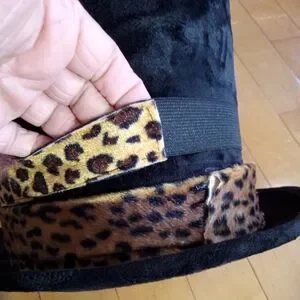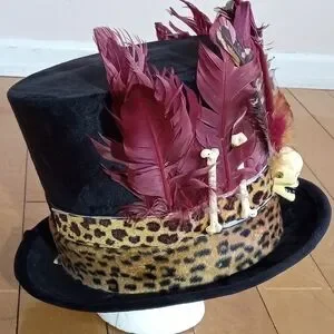 Velour tall top hat with animal print band and with added elastic witch doctor head dressing with skull bones and feathers. The head dressing is from Costume USA and can be removed from the hat. Great for a costume party, festival or concert. Great pre-owned condition with no flaws noted.