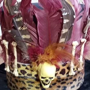 Witch doctor Voodoo top hat leopard print skull bones and feather details