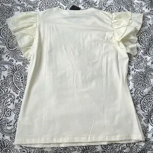 Cream tee with playful floral pattern. Short sleeves with ruffle detail. Perfect for casual wear.