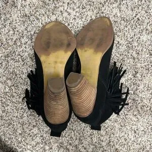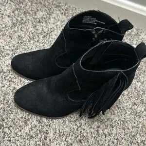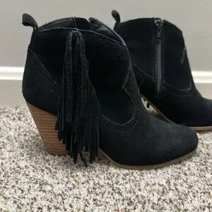 Step out in style with these chic black suede ankle boots. Featuring a trendy fringe detail and a comfortable block heel, these boots are perfect for any occasion. Steve Madden, size 6.5. Signs of normal wear.