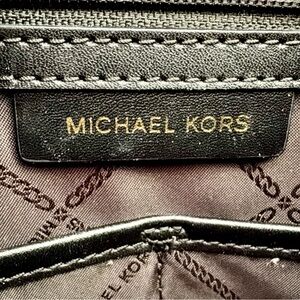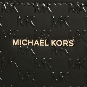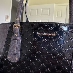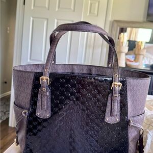 Chic Michael Kors tote with a glossy black front. Features subtle gray accents. Ideal for versatile styling.