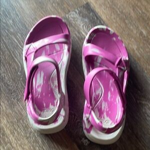 Bright pink sandals with a fun pattern. Easy to wear and durable. Super comfortable, women’s size 10. Worn maybe 5 times.