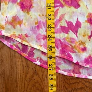 Chic floral blouse with vibrant colors. Features button-up front and roll-tab sleeves. Perfect for casual or dressy occasions.