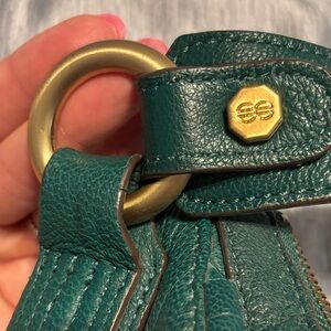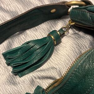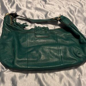 A beautiful pebble soft leather green hobo bag with gold accents. Large zip pocket with inner zip pocket and 2 other pockets. Fold over magnetized closure. Perfect for any occasion. Some slight scuffing on buckle. EUC