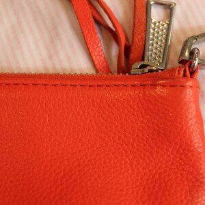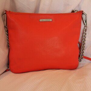 Rebecca Minkoff Cross body leather purse in Orange leather with decorative silver hardware zippers on the front of the bag.  Zipper pulls are long leather pulls. Two of the front pockets open for small area of storage.  Really cute . . not perfect as it has been carried.  Lightweight enough to pack for a vacation or a cruise.