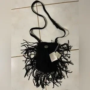Stylish black crossbody bag with fringe detailing. Perfect for adding a touch of flair to any outfit.