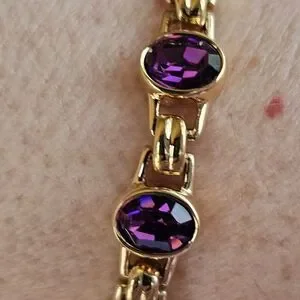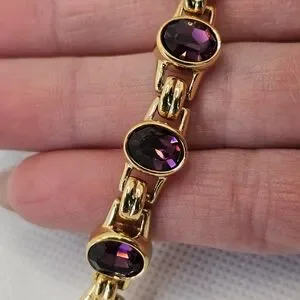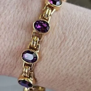 This is a stunning and quite heavy vintage bracelet. The color of the crystals changes from deep red to burgundy with bits of purple and blue. The combination of yellow gold with the oval shaped Swarovski crystals is simply stunning. This would look good with so many looks. Length is 6.75". Based on how it should fit. It would fit a 6 to 6.5" inch best. The Swarovski swan is embossed on the back in the second photo.