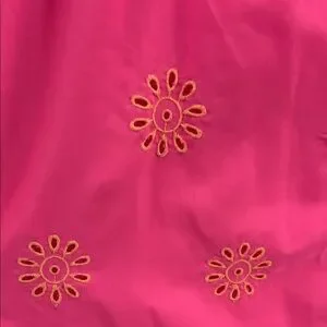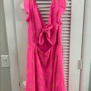 Vibrant pink midi dress with floral cutout design. Features a V-neck and ruffled sleeves, and open back. Perfect for a stylish look. Worn once