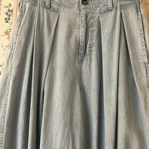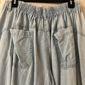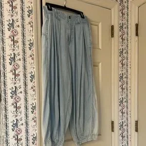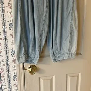 Light weight light wash barrel jeans with elastic in back for adjustable sizing. XS but measures approximately 15” unstretched flat. Love them, so comfortable but not reaching for them anymore. No flaws from smoke free home! Like new.