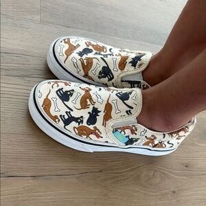 Vans slip-on sneakers with a fun Simpsons pets cartoon design. Features cream, black, and brown colors.