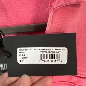 Stylish pink Meg utility romper by PAIGE. Features long sleeves and a drawstring waist. Perfect for many occasions