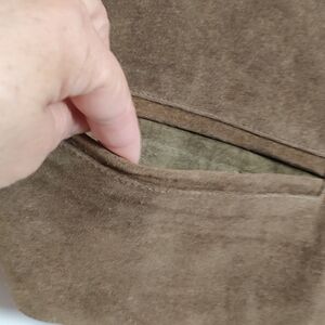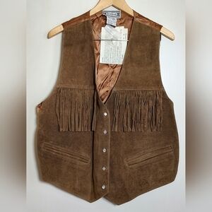 Stylish brown suede vest with fringe detail. Perfect for adding a western touch to any outfit. Featuring pearl snap buttons, small front pockets, and satiny back fabric. NWT with no flaws noted.