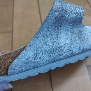 Stylish and comfortable Birkenstock Arizona sandals in a silver tone with gold hardware. Birks are renowned for their cork and suede orthopedic footbed and are built to last. Perfect for everyday wear. Excellent pre-owned condition with light wear to the sole and footbed.