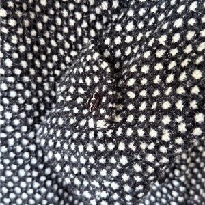 Elegant pea coat with a classic polka dot pattern. Double-breasted design with a stylish silhouette.