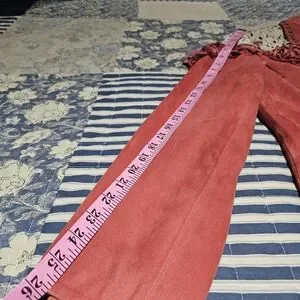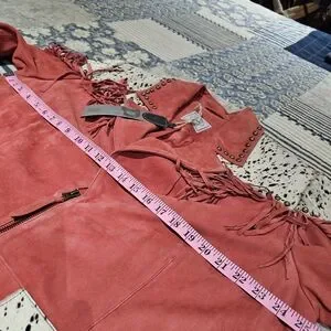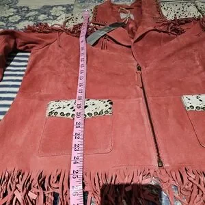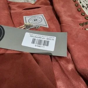 Double D Ranch Lucky Rodeo Red Chrome Jacket with fringe, metal studds and genuine hair on hide accents, center front zipper, and two front pockets. New with tag, smoke-free home. Original price was $850. Selling price $695. Pit-to-pit = 26", shoulder to bottom = 28". Leather suede jacket with fringe detailing. Features hair on hide accents on shoulders, back yoke, and pockets. Stylish and bold design.