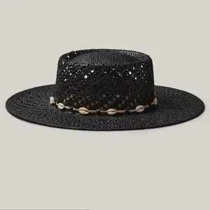 Discover the essence of summer with the Waverly Boater Hat by Hemlock Hat Co. Crafted from 100% paper straw, this lightweight and breathable hat features a black open-weave design, a telescope crown, and a natural shell and bead trim around the base. It’s both stylish and practical for beach days, vacations, festivals, or sunny strolls.