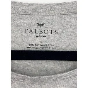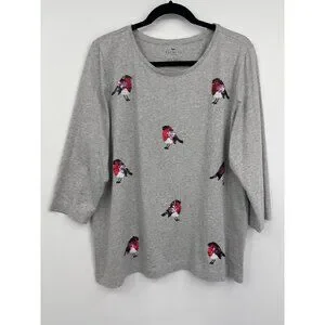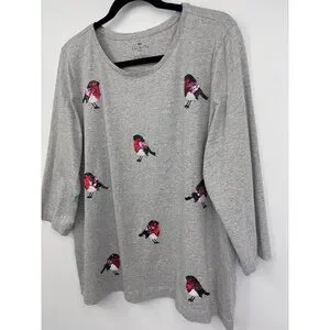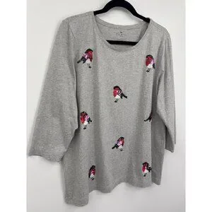 Talbots Cotton Tee T-Shirt 3/4 Sleeve Causal Sequin Birds Gray Size 1X