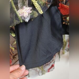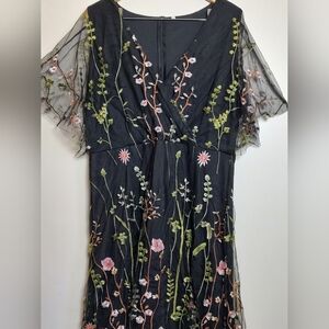 Elegant black dress with intricate floral embroidery. Perfect for any occasion. Featuring a suplice neckline, spandex lined with floral embroidered mesh overlay and butterfly sleeves. Back zip entry. Good pre-owned condition with two small imperfections on the mesh, a tiny seam hole and thread pull on the embroidery, all pictured.