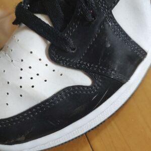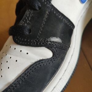Nike Air Jordan sneakers in black and white. Features bold racer blue accents. Iconic style for any outfit. Great pre-owned condition with some scuffing pictured. Size 6Y.