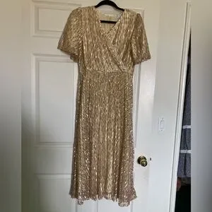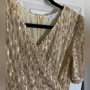 Shimmer in this elegant gold evening dress, perfect for any special occasion. The luxurious fabric and flattering fit make it a must-have addition to your wardrobe. This sequined dress is SO PRETTY! Only worn a couple times, washed on cold and air dried. Great condition!