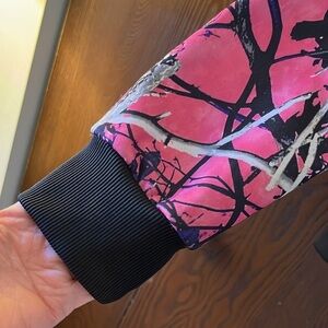 Muddy Girl Moonshine women’s hooded jacket. Pink, black and blue camo. Flannel lining. Zipper ups the front. Black band on sleeves and bottom of the jacket. Heavyweight. Size Large. The length measures 26 inches and pit to pit measures 23.5 inches.