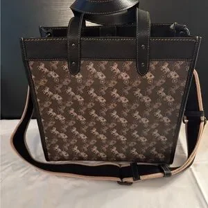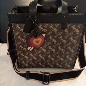 Elegant Coach messenger bag with a patterned design. Features adjustable strap and tag detail.