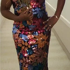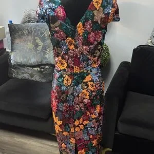 Dazzle in this multicolor sequin midi dress. Features a V-neck and vibrant floral design. Perfect for special occasions.
