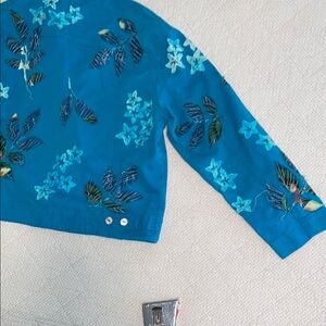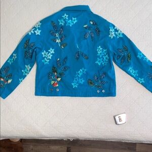 Chico's jean jacket in teal with floral embroidery. Stylish and comfortable for any occasion.