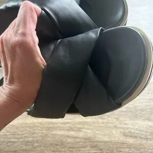 Elegant black crisscross design. Comfortable slide style. Ideal for casual wear.