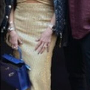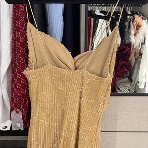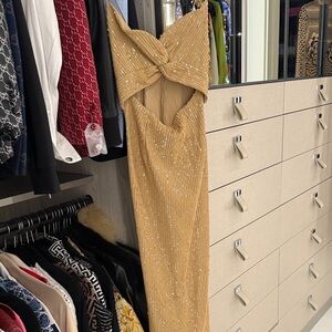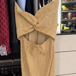 Dazzle in this gold sequin midi dress by Retrofete. Features a chic cut-out design. Ideal for glamorous events.