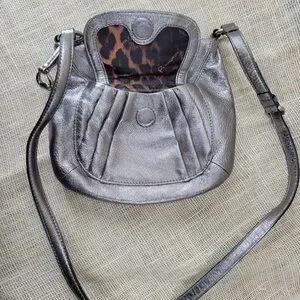 B. MAKOWSKY Silver Metallic Leather Crossbody Purse With Cheetah Print