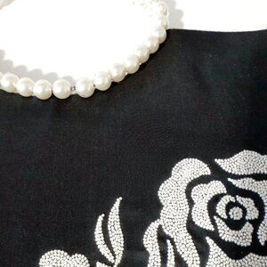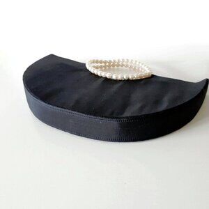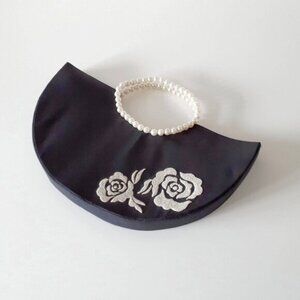 EUC Shiraleah black crescent shaped handbag w faux pearl handles and embroidery