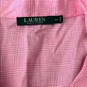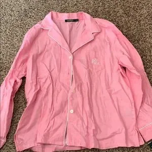 Soft pink pajama top with white piping. Button-up style. Embroidered RL logo on chest.