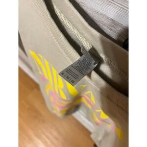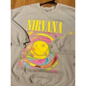 The Nirvana Smiley Face Sand Crew Neck Sweatshirt is a unisex adults' XL pullover sweatshirt made of soft fleece fabric in sand tan color. It features a geometric pattern with elements of art, flowers, hippie, music, rainbow, bohemian, band themes, and 90s nostalgia. Perfect for travel, activewear, parties, or casual wear, this sweatshirt has a regular fit with long sleeves and a crew neckline. The brand, Nirvana, adds a touch of music-inspired aesthetic to this stylish and comfortable piece of clothing.