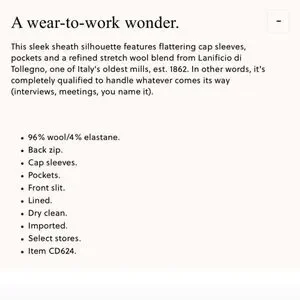 This sleek sheath silhouette features flattering cap sleeves, pockets and a refined stretch wool blend from Lanificio di Tollegno, one of Italy's oldest mills, est. 1862. In other words, it's completely qualified to handle whatever comes its way (interviews, meetings, you name it).
