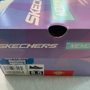 Sleek Skechers sneakers in charcoal with aqua highlights. Features memory foam for comfort.