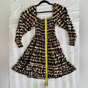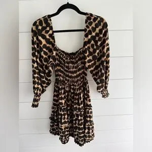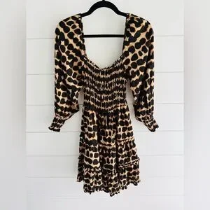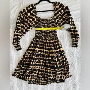 Elegant long sleeve dress with a striking black and tan pattern. Features a flattering fit and stylish design. In very good pre-owned condition, no flaws. Please see pictures to verify condition and measurements.